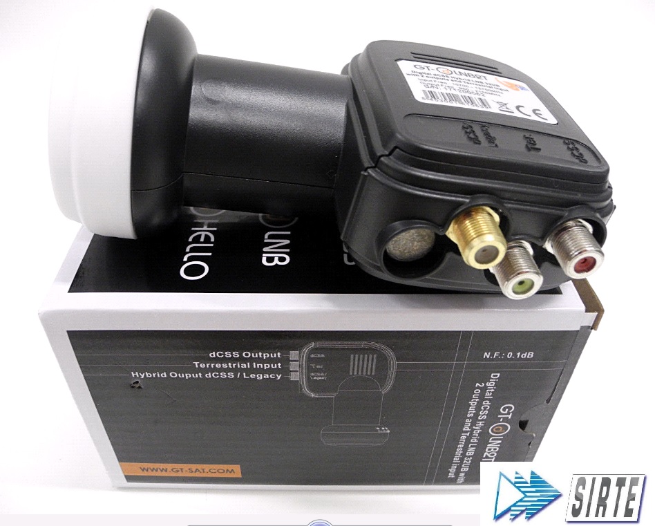 Lnb digitale doppia uscita, dcss 16ub + ibrida (universale/scr/dcss)l'unico lnb veramente universalel'lnb gt-dlnb2t è l'unico lnb sul mercato con doppia uscita dscr monocavo:la prima uscita è compatibile con tutti i decoder scr (4ub) e dcss (12ub)la seconda uscita è invece ibrida e può essere usata come legacy, scr (4ub) e dcss (12ub)con questo sistema, il gt-dlnb2t può essere usato in molteplici modalità, ad esempio:scr + legacydcss + legacydcss + scrdoppio scrdoppio dcsstutto automaticamente, semplicemente selezionando la giusta configurazione sul decoder collegato.100% compatibile con decoder sky q black e platinum e tutti i decoder/tv con tecnologia scr o dcss.