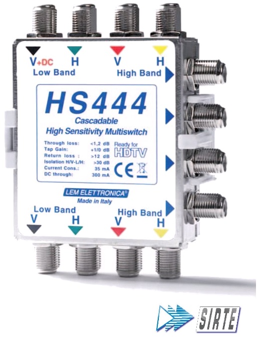 Il LEM HS444 è un multiswitch attivo progettato per gestire segnali satellitari con elevate prestazioni in un impianto da 4 ingressi e 4 uscite con 4 derivate. Grazie alla banda passante estesa e al guadagno bilanciato, garantisce una distribuzione efficace del segnale senza degradazione significativa, con isolamento elevato tra ingressi, uscite e derivate.