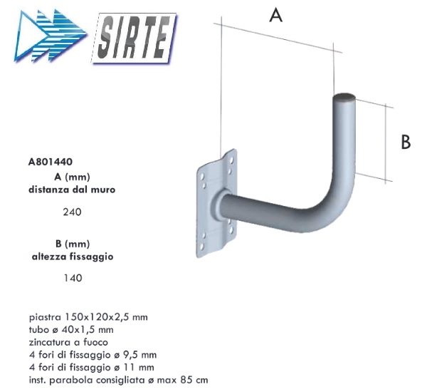 Realizzata con materiali di qualità, la staffa monta un tubo da ø 40 mm e una piastra forata per un fissaggio sicuro e stabile. La sua struttura a L corta da 24 cm consente il montaggio a muro in spazi ridotti, assicurando un supporto affidabile per la parabola satellitare.